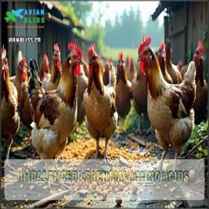To address this, make certain their diet includes high-quality protein and essential amino acid supplements, and regularly monitor their health and adjust feed as needed, as a well-balanced diet is like a safety net for your flock, keeping them vibrant and productive.