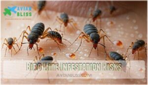 Bedding infestation becomes a nightmare as mites hide in sheets and mattresses. You’ll experience nighttime bites on your back, abdomen, and legs while sleeping, making bird mites dangerous regardless of coverage.