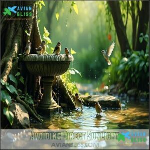 Place the bird bath where shade covers it during hotter hours, balancing light and shelter to guarantee cleaner water and happier visitors.