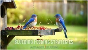 You’ll discover that feeding bluebirds requires specific strategies since they prefer insects and mealworms over traditional birdseed.