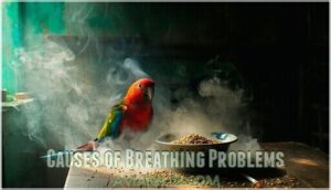 Your bird’s breathing problems can stem from various sources including vitamin A deficiency from all-seed diets, environmental pollutants like cigarette smoke, and infections caused by bacteria, fungi, or viruses.