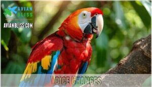 You’ll notice changes in your bird’s respiratory health through vocal alterations, open-mouth breathing, and visible struggle for air.