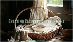 - Create a proper recovery environment by maintaining stable temperatures between 70-75°F, ensuring adequate ventilation without drafts, and changing soiled bedding every 12-24 hours to prevent bacterial growth and promote a quiet environment.