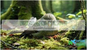 You’ll need to spot wing injuries quickly by watching for obvious signs like awkward wing positioning, drooping, or visible swelling and bleeding.