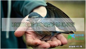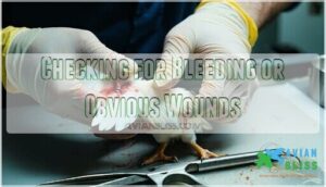 You’ll need to carefully examine the bird for visible signs of wing damage, including awkward positioning, bleeding, or swelling.