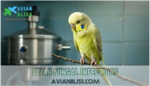 You’ll encounter fungal infections like aspergillosis and candidiasis in birds when their immune systems are compromised by stress, poor nutrition, or unsanitary conditions.