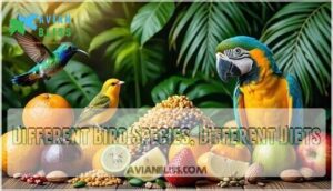 - You should tailor your bird’s nutrition to their specific species, as different birds have unique dietary requirements—parakeets don’t eat like macaws and carnivorous birds need different nutrients than herbivorous ones.