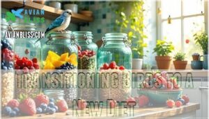 You’ll need to modify your bird’s diet gradually over several weeks, mixing new foods with familiar ones in slowly changing ratios until they’ve fully adjusted.