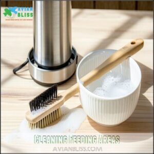 Wash feeders weekly using bird-safe soap, scrub brushes, and warm water.
