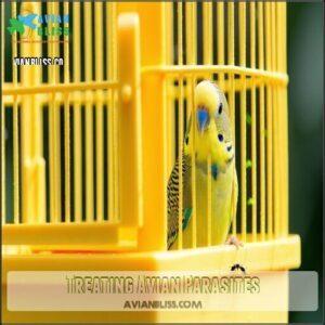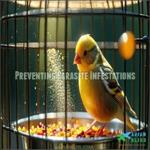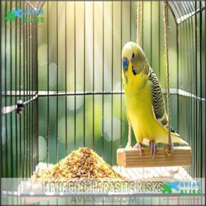 You’ll substantially reduce parasite threats to your feathered friend by establishing a consistent routine of cage cleaning and health monitoring.