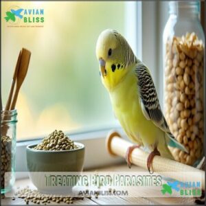 You’ll need to act promptly with appropriate medications when treating your bird’s parasite infection, whether using ivermectin for mites, metronidazole for protozoal parasites, or fenbendazole for internal worms.