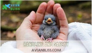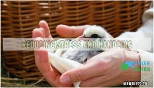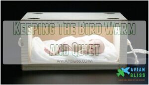 Cover the container with a towel to reduce visual stimuli. Remember, your bird handling precautions directly impact their survival chances during this critical period.