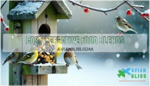 A varied birdseed mix guarantees high-calorie foods and attracts diverse species. Avoid blends with milo, as it’s often rejected, and instead, consider high-quality seed options for a varied birdseed mix.