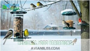 Understanding these differences guarantees your efforts support diverse bird species, creating a thriving backyard ecosystem suited to unique regional conditions, which is essential for regional bird feeding.