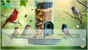 You’ve picked quality bird seed types, but cheap mixes can waste your money on fillers birds ignore. Most discount birdseed contains milo, wheat, and oats that end up scattered on the ground.