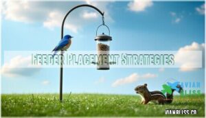 - Place feeders strategically at least 10 feet from trees for safety, 5+ feet high to deter squirrels, and near water sources to create an irresistible combination that birds can’t resist.