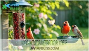 Don’t forget freshness—clean and fill feeders often to keep cardinals coming back. With the right approach, you’ll create a welcoming space for these vibrant visitors.