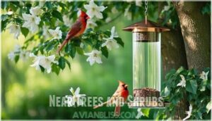 Positioning cardinal feeders near trees and shrubs makes perfect sense.