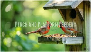 Cardinals require wide platforms or large perches because they’re bigger birds with broader bodies, and they prefer open feeding areas where they can see their surroundings clearly.