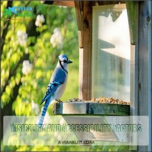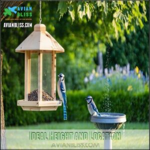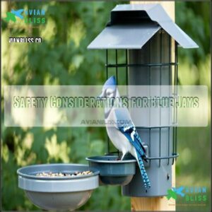 Creating a safe bird feeder setup for Blue Jays means thinking a step ahead of threats. Position your feeder carefully—open spaces work best but avoid dense shrubs that might hide prowling cats. It’s like designing a protective café for birds: inviting yet secure.