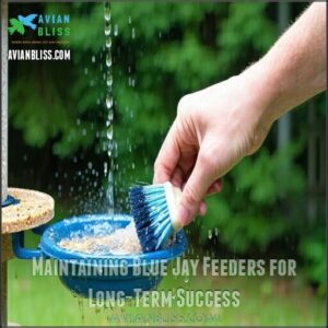 Regular maintenance guarantees your feathered visitors return consistently, as blue jays quickly abandon dirty or unreliable food sources in favor of healthier options, and this is crucial for their well-being and the success of your feeder, making regular maintenance a must.