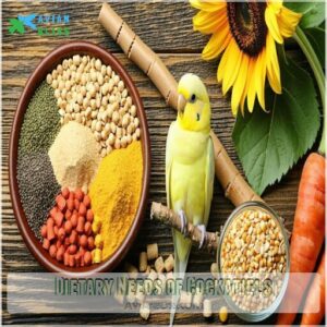 Your feathered friend needs specific amino acids—particularly lysine and methionine—which they can’t produce naturally. Great protein sources include high-quality pellets, legumes, nuts, seeds, and insects.
