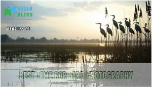 You’ll spot wading birds like herons and egrets striking elegant poses, perfect for capturing their graceful antics and serene reflections.