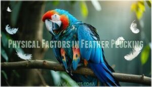Hormonal imbalances disrupt normal feather growth cycles, while parasite infestations cause irritation.