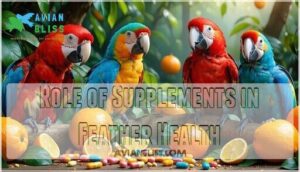 You’ll notice brighter, stronger feathers by providing vitamin A, biotin, and omega-3 supplements. Add calcium for structure, make certain proper lighting, and consider moulting formulas like FeatherUp! during seasonal changes.