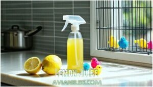 Common household items like white vinegar, baking soda, hydrogen peroxide, and lemon juice work effectively as natural disinfectants while protecting your feathered friend from harmful chemicals, using items like white vinegar.
