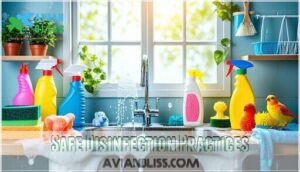 You want to keep your bird safe, so it’s essential to follow proper disinfection practices. Using bird-safe cleaners, good ventilation, and careful handling can prevent harmful chemicals and cross-contamination.