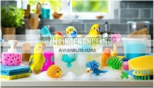 You’ll need to establish routines for rotating toys, inspecting them for damage, replacing worn items, and sanitizing new purchases before introducing them to your feathered friend, which is crucial for engaging your bird with safe playthings.