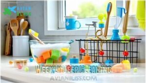 Your scrubbing techniques should target crevices where food particles accumulate. Rinsing thoroughly removes soap residue that could harm your bird. Proper drying methods prevent mold growth. Consider using a specialized cleaner product to guarantee thorough disinfection. Bird toy cleaning frequency matters—weekly deep cleaning keeps your feathered friend healthy and toys lasting longer.