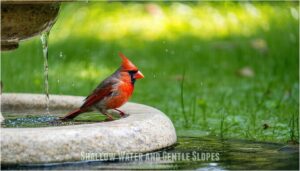 To make your bird bath cardinal-friendly, focus on features like shallow water, gentle slopes, and textured surfaces that guarantee safety and comfort.
