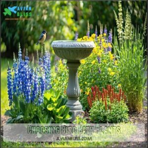 You’ll transform your bird bath into a feathered hotspot by surrounding it with the right plants.