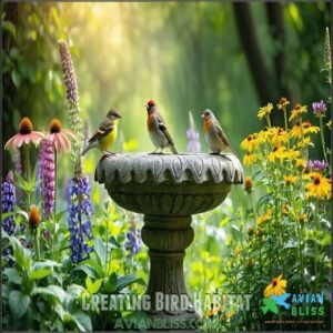 Strategic branch placement creates a natural look while ensuring bird comfort. You’ll notice more visitors when they can easily hop from perch to perch, making your bird bath plants part of an integrated habitat with appealing features.