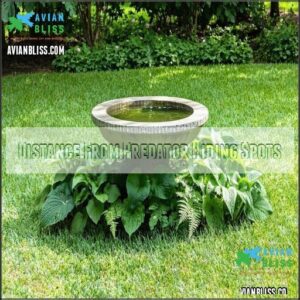 Position your bird bath where birds can easily spot lurking predators. Keep a 10-15 foot Open Space Buffer around it for predator visibility, with clear flight paths and escape route access. Avoid dense shrubbery directly nearby.