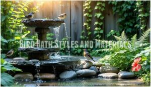 You’ll find a wide variety of bird bath materials from copper and glass to ceramic and stone, each offering unique benefits for your feathered visitors.