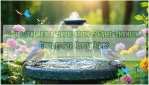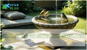 You’ll harness free energy from the sun with solar-powered circulators that keep your bird bath water moving continuously without batteries or electrical outlets.