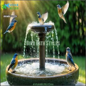 • You’ll find various styles to match your garden aesthetic, from classic pedestal designs to ground-level baths, with materials like ceramic, resin, and metal offering different benefits for durability and ease of cleaning.