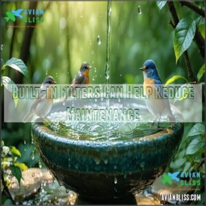 A bird bath with a built-in filter ensures cleaner water, happier birds, and less maintenance for you—nature at its finest!