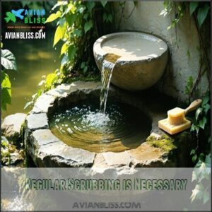 To further inhibit algae growth, consider wildlife-safe enzyme use. Pair this with a deep clean whenever the basin appears visibly dirty to guarantee your bird bath stays sparkling. Don’t forget to rinse thoroughly afterward to protect the material.