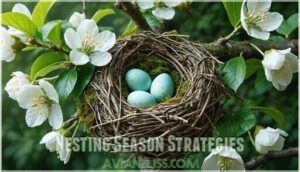 You’ll notice birds putting remarkable effort into choosing safe nesting spots and gathering the perfect materials to build sturdy, camouflaged homes.
