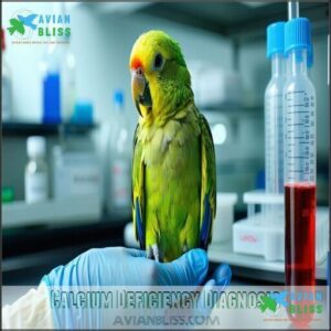 You’ll need to identify the symptoms of calcium deficiency in your bird to diagnose the issue, and this can be done through blood tests, physical examinations, and observing clinical signs.