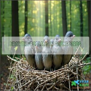 You notice growth problems in young birds with calcium deficiency, affecting skeletal development, feather growth, and muscle development.