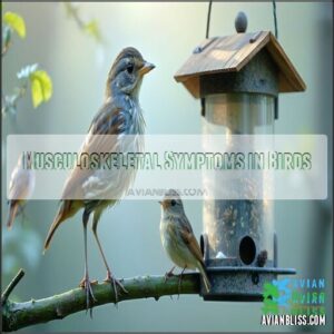 You’ll notice weakness, lethargy, and difficulty walking in birds with calcium deficiency, indicating low blood calcium levels and potential musculoskeletal issues.