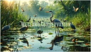 Wetland conservation doesn’t just benefit waterbird species but provides essential ecosystem services like flood control and water filtration.