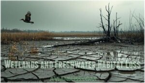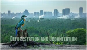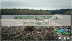 You’ll find that human activities like deforestation, agriculture, and urban development are destroying bird habitats at an alarming rate, with over half of Earth’s natural land now converted for human use.
