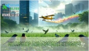 You’ll encounter many direct threats causing bird deaths beyond habitat loss, including collisions with buildings, pesticide poisoning, predation by invasive species, and plastic ingestion.