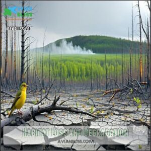 Urban sprawl, deforestation, and agriculture destroy nesting sites and food sources, leaving birds struggling to survive in shrinking, fragmented ecosystems, which is a result of habitat loss.